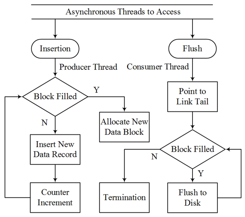When the data block is full, a new block will be allocated for insertion, and the consumer thread may access the block afterwards. When the consumer thread is engaged, all accessible data can be flushed to the disk, except for the case that the block is not filled up. The constant size of each data block can be adjusted to balance the computing efficiency and cost between the producer thread and consumer thread. A size of 100 has been used in the presented system. Together with the asynchronous logging scheme, this effectively separates the producer and consumer thread and eliminates the race condition.