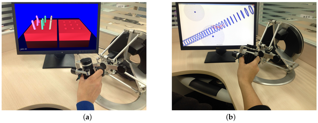 The positive effects of virtual reality on rehabilitation therapy have been extensively validated, and impaired motor capabilities are improved via robot-assisted sensorimotor activities [,,]. More engaging therapies, ensured safety and deep immersion can be obtained with force feedback and integrated into the designed virtual scenario and rehabilitation sessions. In our previous work [], a “flying through a spatial tunnel” scenario has been realized with a haptic interface to re-train the dexterous manipulation capabilities of the upper limb. The bimanual haptic desktop system (BHDS) integrated with the video display terminal (VDT) has been established for video game-like exercises in a bimanual manner [].
