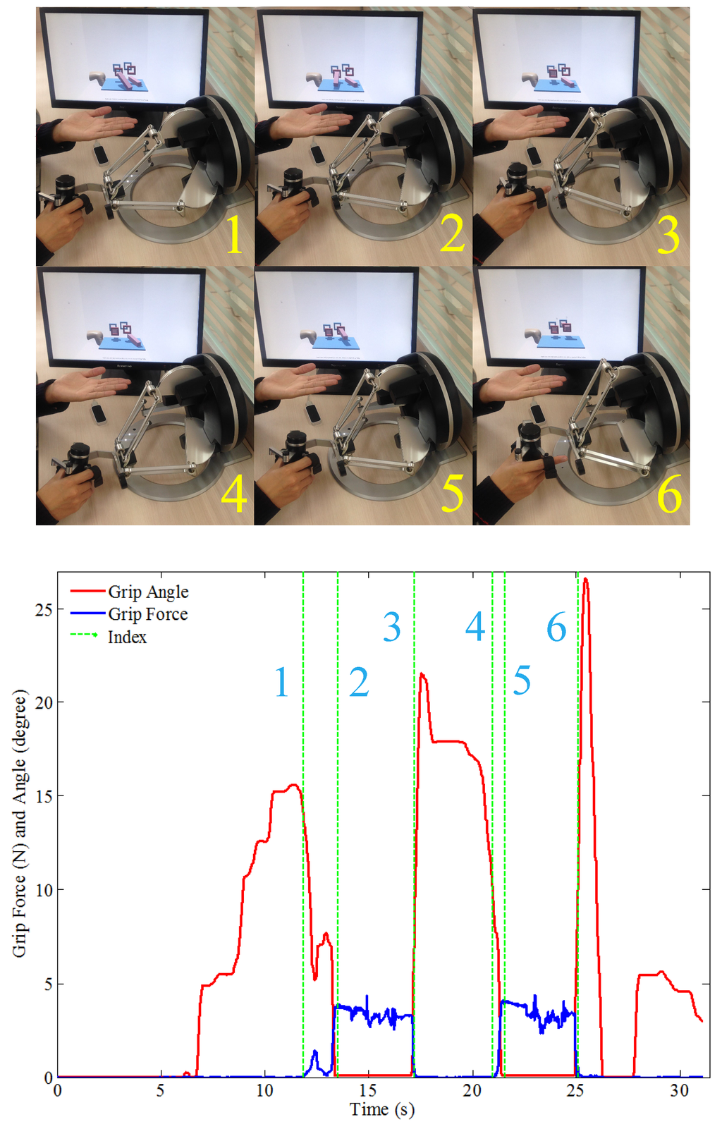 As shown in Figure 10, each operation of the proposed training can be divided into seven phases. When the virtual plate is moved by the left hand to the ambient space of the right hand, the virtual gripper approaches and touches a virtual block for the first time. The grip angle tends to decrease while certain grip force is applied to the block, during the interval between 1 and 2. Then, between 2 and 3, this block is moved to the target position, with the grip force persisting, and the gripper angle remains low. When the first block is put on the target frame, the subject opens the gripper again, approaching the second block. Then, the operation is conducted with the second block between 4, 5 and 6, just like with the first block. In the implemented complementary task, the left hand is taken as the non-dominant healthy side, to support and lead the paretic arm by moving and holding the virtual plate. The left hand offers supporting and stabilizing functionality. Precise manipulation is achieved by the arm, especially the wrist and forearm movements, in series with the grip.