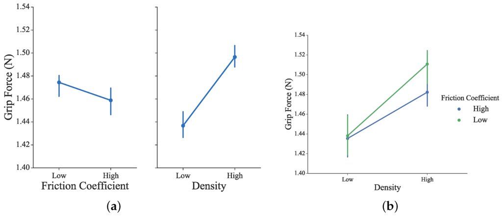(a) Mean grip force of all subjects under four experimental conditions; (b) Mean grip force of all subjects across all conditions in the factor plot.