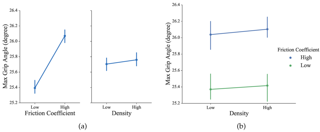 (a) Max grip angle of all subjects under four experimental conditions; (b) Max grip angle of all subjects across all conditions in the factor plot.