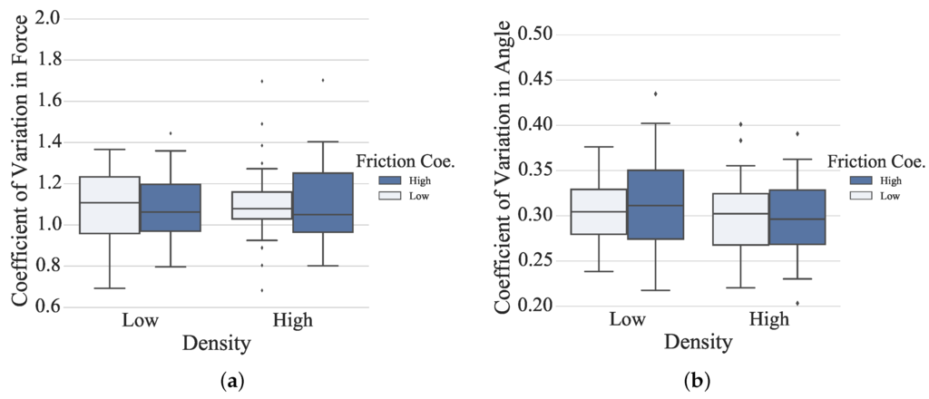 An adapted difficulty level of rehabilitation therapy is essential for extensive engagement and minor frustration []. The coefficient of variation (CV) can be an effective measure to evaluate the challenging level of the proposed rehabilitation task to distinguish the performance in each experimental conditions []. The higher CV value suggests that the experimental condition is more challenging. As shown in Figure 13, from the grip force point of view, no significant differences were observed under different conditions (for density: F1156 = 0.59, p = 0.44; for the friction coefficient: F1156 = 0.04, p = 0.82). The highest CV value was obtained for the condition of low density under low friction, which can be challenging to the sensorimotor system in the sense that the smallest grip force needs be produced and fine force control capability is required. The CV values in the other three conditions were very close. From the grip angle point of view, no significant differences were observed under different conditions (for density: F1156 = 2.53, p = 0.11; for the friction coefficient: F1156 = 0.05, p = 0.83). It is not clear yet whether the maximum grip aperture indicates the key point of the kinematic duration or a preliminary portrait of the grasp, especially in the virtual scenario, where the perception of objects is different from the physical world.