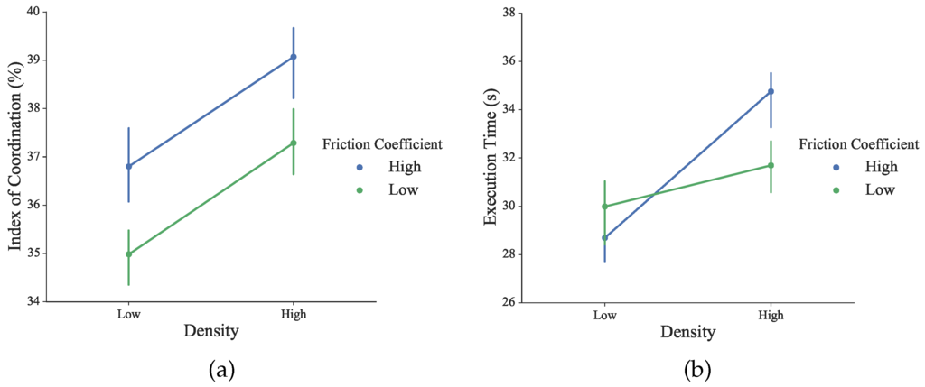 The execution time across all conditions was calculated to assess the bilateral performance during the training session. As shown in Figure 14, blocks with high density required more time to finish. Across all of the conditions, differences of execution time were not statistically significant (for density: F1156 = 1.32, p = 0.25; for the friction coefficient: F1156 = 0.07, p = 0.79).