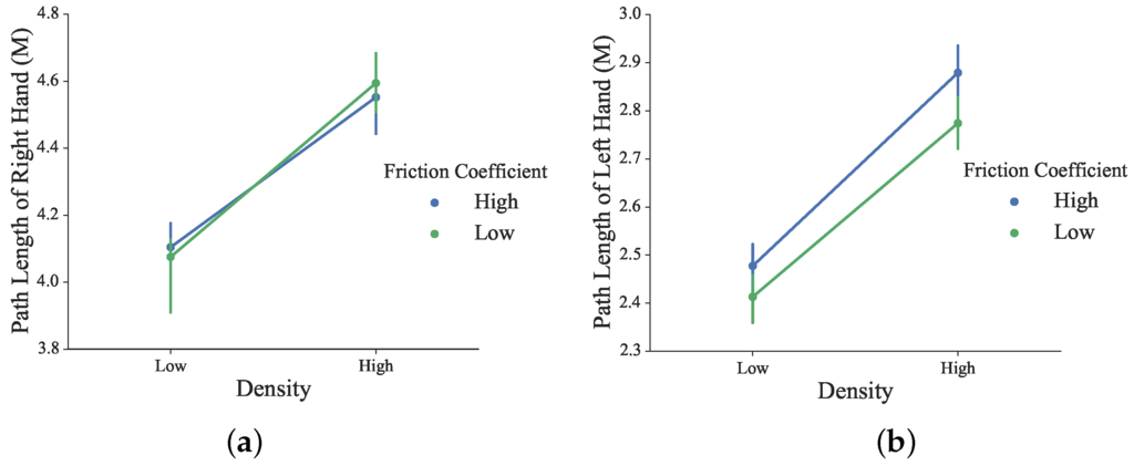 The traveled path length of the left and right hands during the task is shown in Figure 15. For both the right and left hand, the higher the density, the longer the traveled path was. The effect of the friction coefficient was weak. The statistical test showed no significant difference in the path length of the right under different conditions of the blocks’ density and friction coefficient values (F1156 = 2.65, p = 0.11 for density; F1156 = 0.0005, p = 0.98 for the friction coefficient). Significant differences in the path length of left hand were observed under different conditions of the blocks’ density (F1156 = 4.37, p = 0.04). Post hoc analysis showed the statistical difference in path length between different densities. Both the supportive left hand and manipulative right hand have traveled a longer path for the high density condition.