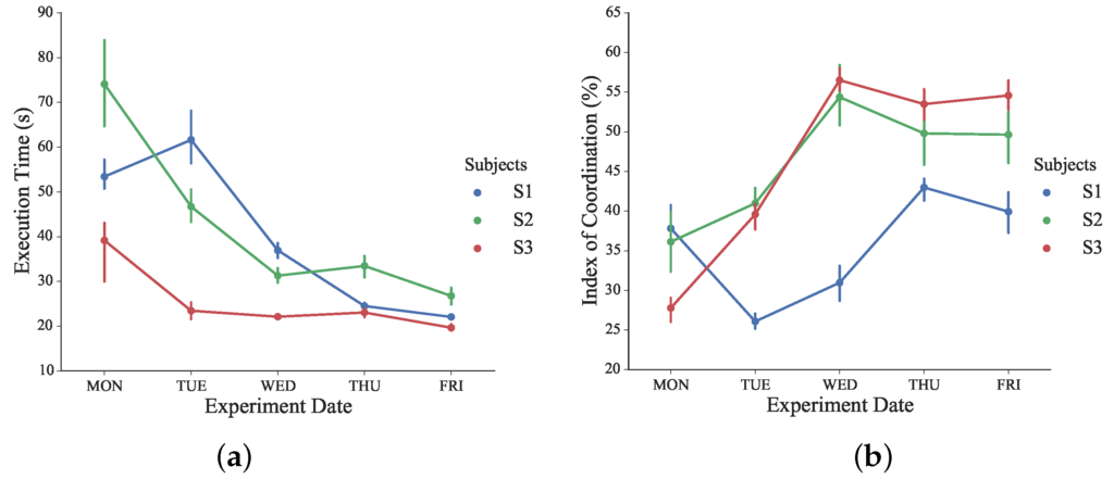 (a) Execution time of all subjects during the learning phase; (b) The index of coordination of all subjects during the learning phase.