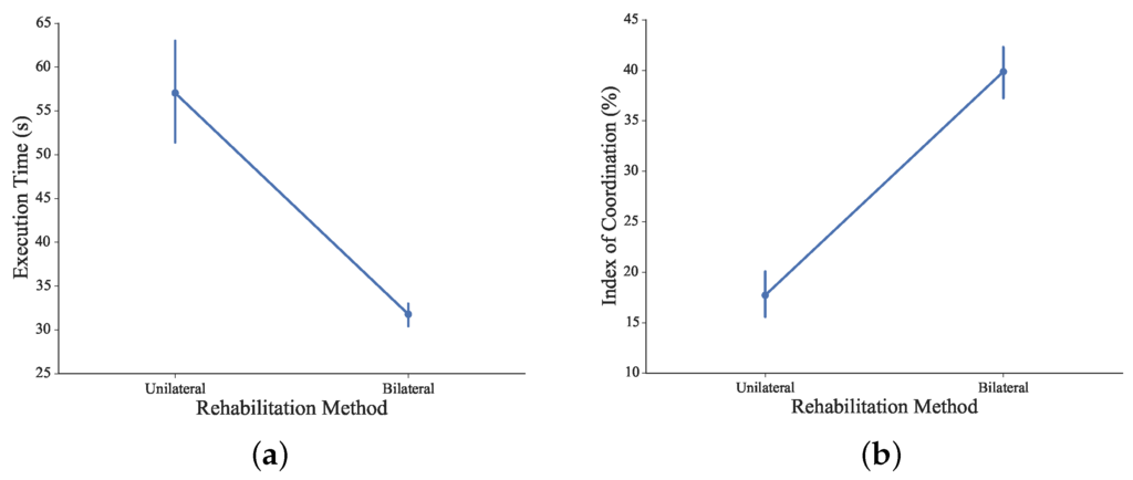 The comparison of execution time and IC between unilateral and bilateral methods is shown in Figure 17. With the unilateral rehabilitation method, subjects’ left hands were constrained, and their right hands performed the complementary task solely.