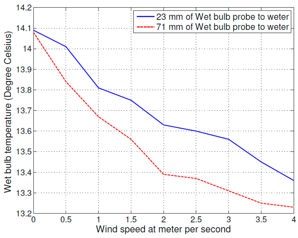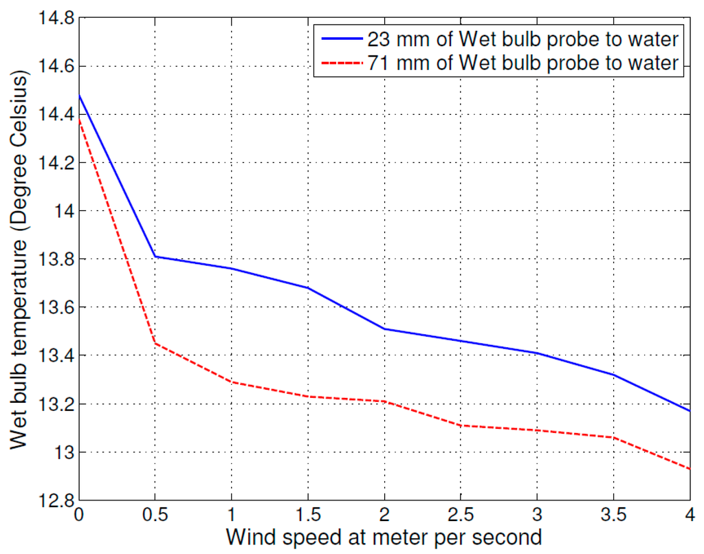 Based on the above results, we estimated the sensitivity of wet bulb temperature to the variation of various environmental factors. At a constant air flow speed of 2 m/s, different cloth sizes caused 0.2 °C uncertainty in the wet bulb temperature. Different distances between wet bulb temperature probe to water level added 0.3 °C uncertainty, and if the air flow speed changed from 2 m/s to 0.5 m/s then the uncertainties would increase approximately 0.3 °C. The total change was approximately 0.8 °C of the measured wet bulb temperature value.