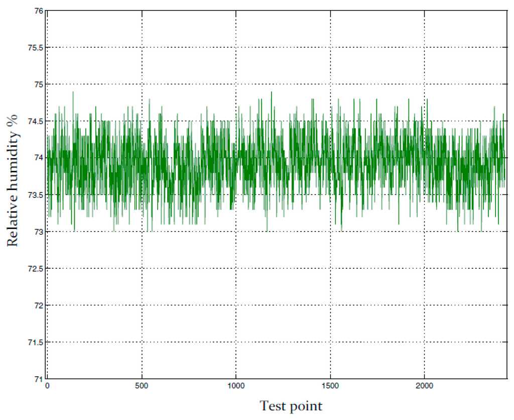 Temperature directly influences relative humidity measurement accuracy and stability. The effect of the varying factors in the relative humidity measurement can be evaluated using Table 2. The coupling relationship of temperature and relative humidity close to the values of 13 °C and 73% RH are given in Table 2. Table 2 shows the coupling relationship of temperature and relative humidity in a hermetically sealed container.
