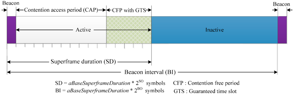 The IEEE 802.15.4 MAC protocol [4] operates in three frequency bands: 16 channels in the 2.4 GHz Industrial, Scientific, and Medical (ISM) band, 10 channels in the 915 MHz ISM band, and 1 channel in the European 868 MHz band. In the IEEE 802.15.4, two operational modes are defined: the beacon enabled mode and the non-beacon enabled mode. In the beacon-enabled mode, the communication is synchronized and controlled by the network coordinator. A superframe consists of active and inactive periods; the active period is further divided into three parts consisting of a beacon, a CAP using slotted CSMA/CA, and a CFP, as shown in Figure 1. The CFP contains up to seven guaranteed timeslots (GTS). All communication must take place during the active parts and the devices can sleep in an inactive part to conserve energy. The structure of the superframe is determined by the network coordinator using two parameters, the superframe order (SO) and the beacon order (BO). The SO is used to describe the length of superframe duration (SD), whereas, the BO defines the beacon interval (BI). There are mainly two types of devices in the IEEE 802.15.4: a full function device (FFD) and a reduced function device (RFD). The FFD can support all the network functions and operate as the network coordinator as well as an end device, whereas, the RFD can only be used as an end device. The FFD performs energy detection (ED) to detect the peak energy of a channel and select the appropriate channel for data transmission.
