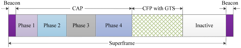 In the IEEE 802.15.4 MAC, the performance of the CAP significantly influences the collision probability and the final throughput. If the nodes are densely deployed in a narrow region, the contention complexities increase and lead to high collision ratios and significant energy consumption. The main goal of the proposed MAC is to provide QoS and low power consumption for various applications by dispersion of the contention complexity. Here, we divide the CAP into four sub-phases for each priority level of the traffic, as shown in Figure 5. Each specified access phase has dynamically changing length and is calculated by the proposed algorithm at the central coordinator.