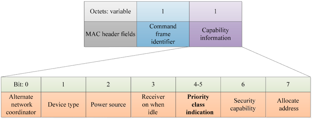 where is the length of the sub-phase , is taken from the starting point of CAP, is the length of the CAP, is the total number of nodes in the traffic category of priority , is the total number of nodes, and is initially set to zero . To obtain information regarding the node’s priority classes, we modify the IEEE 802.15.4 association request command, as shown in Figure 6. Further, we assume that each node supports only one type of data. When newly arrived nodes join the network, the coordinator has the ability to sense the changes in the number of nodes of each class in the CAP of the previous superframe and calculate the value of the number of nodes in each traffic category. Medical services must satisfy a delay of 125 ms or less and consumer electronics (CE) services have to satisfy a delay requirement of 250 ms or less. Based on these delay requirements, the average transmission delay of each category is calculated by Equation (2):