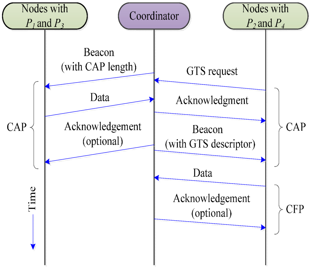 In the IEEE 802.15.4 MAC, the superframe consists of a CAP and a CFP. The CAP is suitable for the transfer of the command messages and short data, whereas, the CFP is implemented for continuous data. In the CAP, each node transmits its packets to a coordinator using the CSMA/CA procedure. In the CFP, each node transmits its packets to the coordinator by using dedicated guaranteed time slots (GTSs) without contention with the other nodes. In order to transmit packets in the CFP, each node transmits the request packet for the CFP to the coordinator in the CAP using the CSMA/CA procedure. When the coordinator successfully receives the GTS request packet, it allocates the GTS to the node, accordingly. The data from the P1 and P3 nodes are transmitted immediately after accessing the channel in the CAP. However, the P2 and P4 nodes send the GTS request command in the CAP to apply for GTS allocation. The slot allocation mechanism and data transfer procedure for different traffic priorities are shown in Algorithm 1 and Figure 7, respectively.