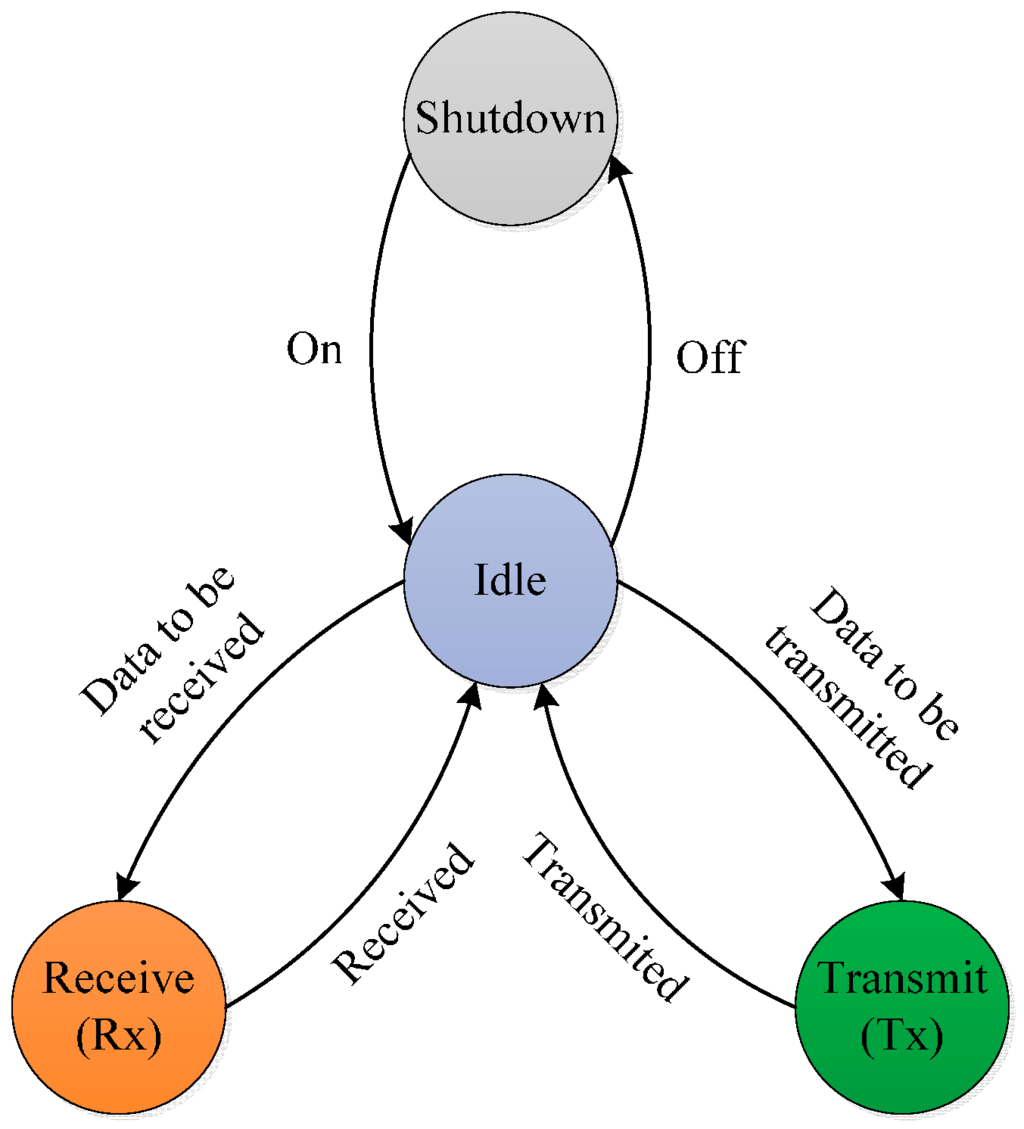 Energy efficiency is one of the key measurement parameters for a reliable and efficient MAC protocol design. The energy consumption is based on the transceiver’s activity; the transition state of the transceiver is shown in Figure 8. To minimize the energy consumption, the idle and wakeup states play a vital role. We assume constant energy consumption by the sensing and processing units. Let be the total consumed energy in one cycle, is the energy consumed in an idle state, and is the energy consumed in a wakeup state. Then: