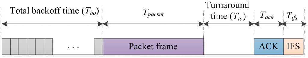 The data frame transmission sequence is shown in Figure 9. is the total backoff time (i.e., channel access delay), is the data packet transmission time, is the transceiver’s turnaround time, is an ACK frame transmission time, and is the time for an interframe space (IFS). The IFS could be either short inter-frame spacing (SIFS) or long inter-frame spacing (LIFS), depending upon the size of the MAC frame. The average transmission delay Tl is the time needed to transmit a packet from the node to the coordinator and can be calculated as in [27] as follows: