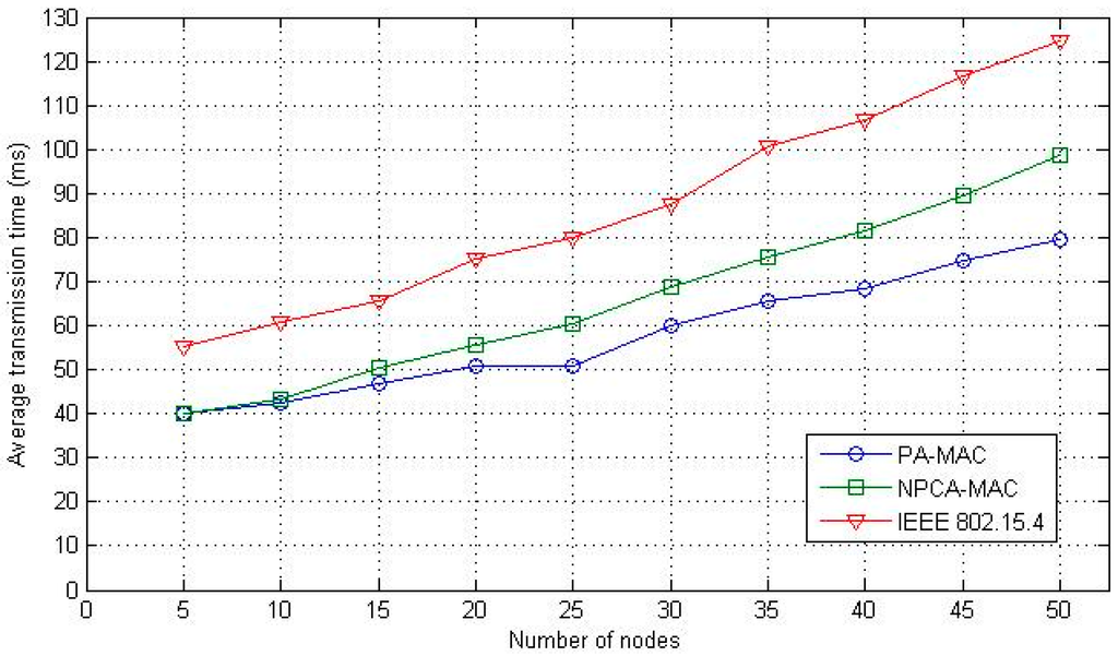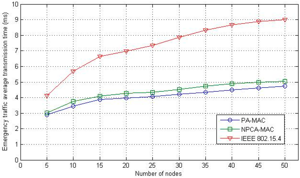 In the NPCA-MAC, continuous and discontinuous data transfer procedures and the use of GTSs are not considered. There is no difference in the transmission of emergency traffic in the proposed MAC and the NPCA-MAC. Figure 11 shows the emergency traffic average transmission time for the proposed PA-MAC, NPCA-MAC, and the IEEE 802.15.4 MAC. The main contributor to the transmission delay is the channel access delay. The emergency nodes have to transmit a small-size data packet in a very small time interval. If the channel becomes extremely busy, the sensor nodes have to back off more periods to complete the channel access, thereby causing longer channel access delays. Here, we can see that the average transmission time of all the three protocols increases with the increase in the number of sensor nodes. However, the proposed PA-MAC and the NPCA-MAC exhibit a better performance than the IEEE 802.15.4 MAC protocol.