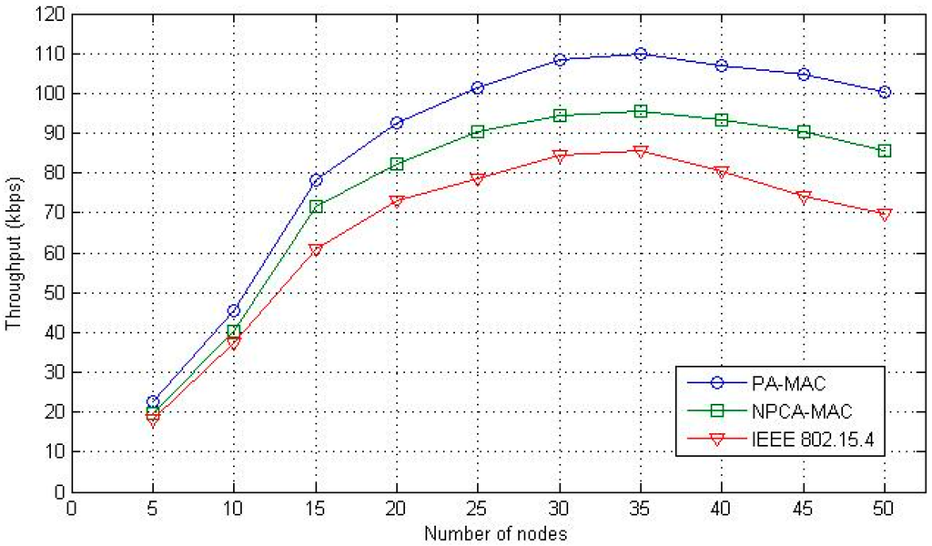 In Figure 12, the overall performance of the network throughput as a function of the number of nodes is illustrated. All three schemes show a similar performance, when the number of sensor nodes is less than 10. The proposed PA-MAC and the conventional NPCA-MAC, however, provide better performances compared to the IEEE 802.15.4 MAC protocol. In the IEEE 802.15.4 MAC, the collision ratio increases sharply with the number of sensor nodes. Hence, more resources are wasted on data packet collision rather than on effective data transmission. The throughput of all the three schemes seems to decrease as the number of nodes exceeds 35, because of a high contention complexity and an increased packet collision rate. Although the collision rate increases with the number of data packets, the radio resource on the data channels is efficiently managed in both the PA-MAC and the NPCA-MAC, according to the data traffic. However, in the channel access pattern, prioritization of data traffic, and the GTS allocation for continuous data traffic, the proposed PA-MAC performs better than the conventional NPCA-MAC.