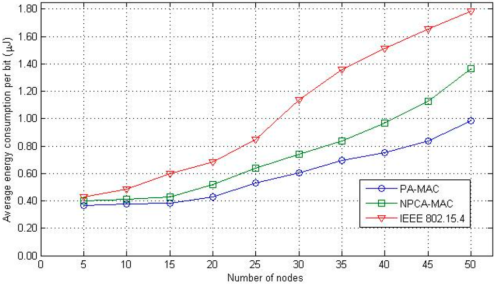 The evaluation of the average energy consumption per bit is shown in Figure 13. The increase in energy consumption is mainly because of packet collision and packet retransmission. The energy consumption of the IEEE 802.15.4 MAC protocol increases sharply with the number of nodes, because of high contention complexity. High contention complexity causes a high packet collision rate and results in a large number of retransmissions. The traffic prioritization scheme reduces the contention complexity and decreases packet collision and packet retransmission. The proposed PA-MAC and the conventional NPCA-MAC show better performances than that of the IEEE 802.15.4 MAC protocol. Above all, the proposed PA-MAC prioritizes channel access and incorporates the classification of the data transfer procedure, thereby reducing the contention complexity, the packet collision, and the packet retransmission. Therefore, the proposed PA-MAC outperforms the conventional NPCA-MAC and the IEEE 802.15.4.