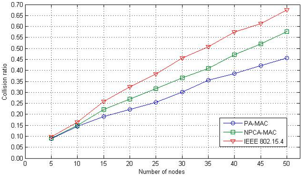 Figure 14 shows the collision ratio of the overall traffic in a network as a function of the number of nodes. The number of collisions increases with the increase in the number of sensor nodes in the WBAN. In the IEEE 802.15.4, a slotted CSMA/CA without a prioritization policy did not solve the contention complexity problems; the collision ratio increased discernibly when the number of nodes exceeded 20. The proposed PA-MAC and the NPCA-MAC provide a low collision ratio as compared to the IEEE 802.15.4 MAC protocol, owing to the prioritization of data traffic and the classification of continuous and discontinuous data transfer procedures. With features including channel access patterns and GTS allocations for continuous data traffic, the proposed PA-MAC outperforms the conventional NPCA-MAC.