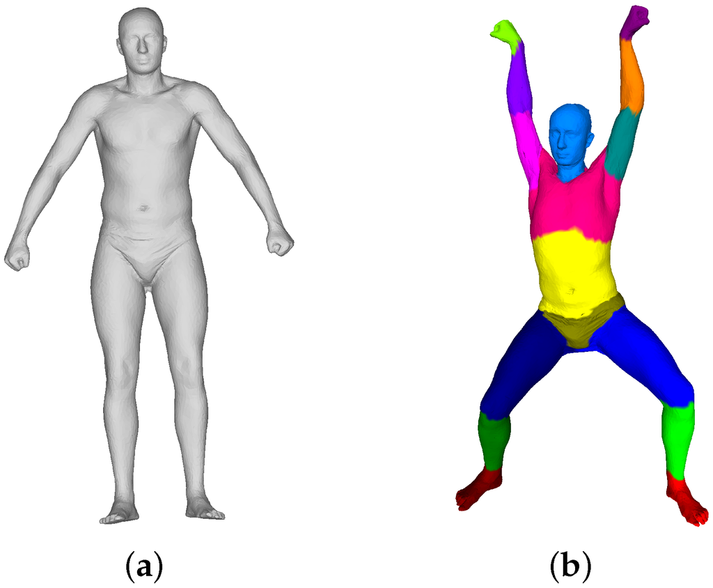 (a) Our template and (b) the template in a different pose with 16 color-coded parts.