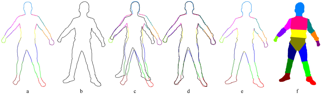 Stages in our kinematic classification. (a) The silhouette of our template projected to an image; (b) the silhouette of people in an image; (c) the result before alignment; (d) the aligned result after coherent point drift (CPD) [26]; (e) the classification of people’s silhouette obtained from our template; (f) the kinematic classification result. First, we extract the silhouettes from our template and people; then, we can classify the people’s silhouettes after aligning the silhouette in (b) to (a). Finally, we obtain the kinematic classifications (f) of the people in the images through a fully-connected conditional random field (CRF) model.