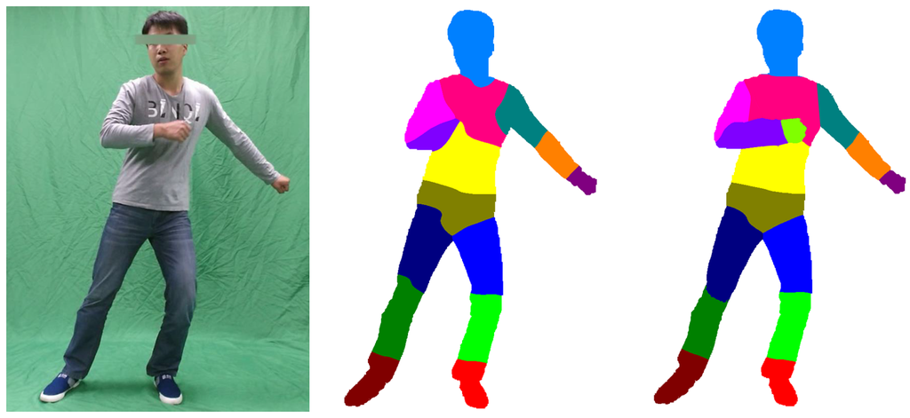 We use the mean field method with an efficient implementation proposed by Krahenbuhl et al. [28] to optimize Equation (3). To show the importance of the motion term in Equation (4), we assign , and we solve the dense CRF model in the same way. Figure 5 demonstrates that the classification with the motion term (the right figure in Figure 5) is more precise than the classification without the motion term (the middle figure in Figure 5), which results in incorrect classifications, such as the right hand and the fuzzy classification of the right leg. However, with the help of the motion term, our kinematic classification not only provides a clear classification of the right leg, but also distinguishes between the right hand and the chest.