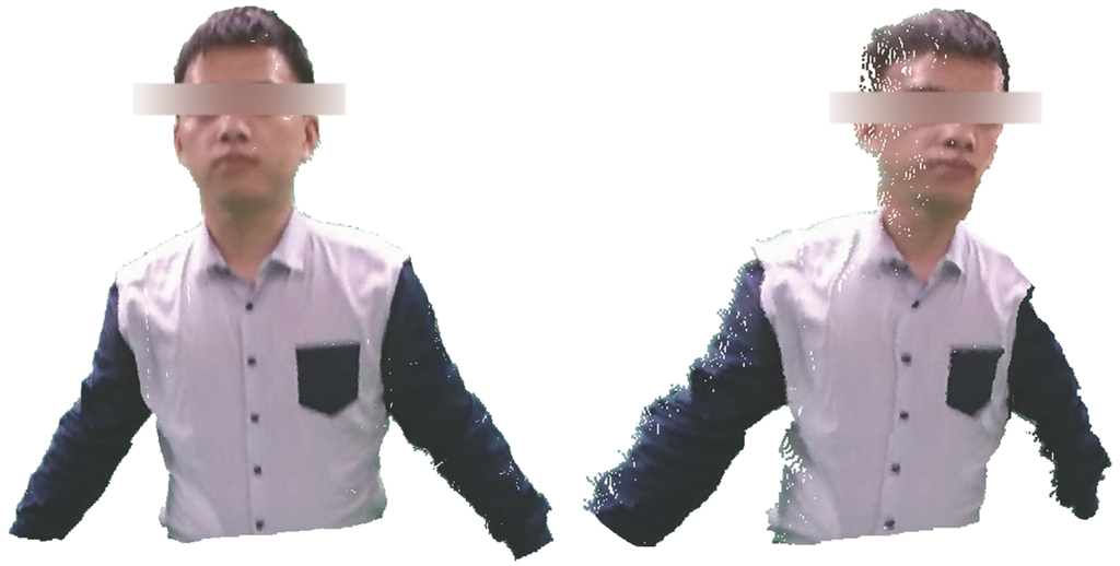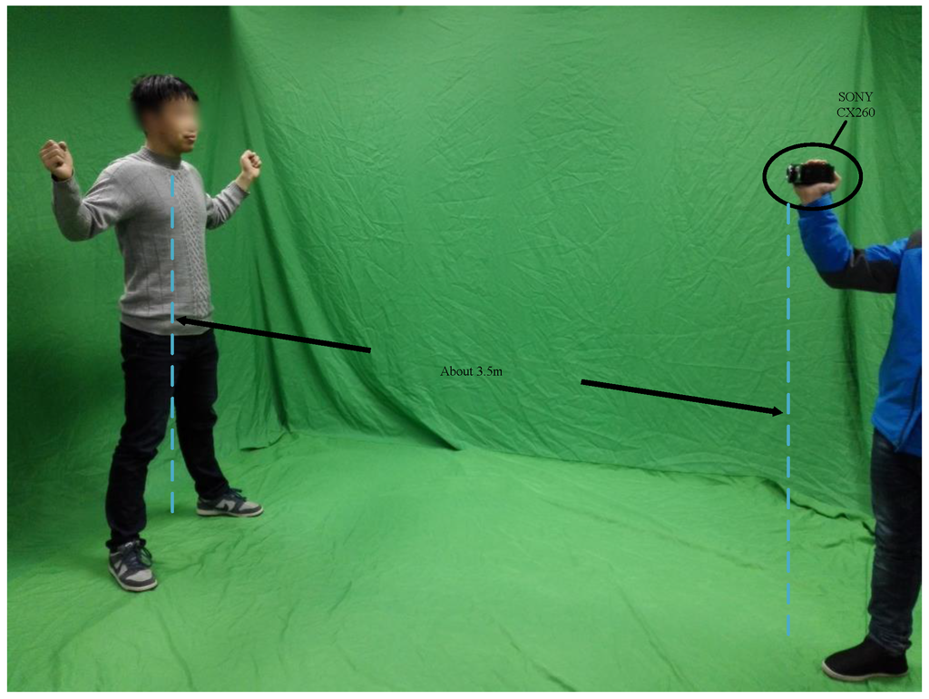 In the following experiments, we validate our method on a dataset containing a variety of RGB videos of 30 people performing various types of motion. Our system was developed with MATLAB and executed on an Intel i7 CPU at 3.40 GHz with 24 GB RAM. The images in the dataset were all recorded at a resolution of using SONY CX260 under conditions illustrated by Figure 9 and processed off line. Each sequence consists of approximately 450 frames. On average, we obtain an instance from every ten frames. To evaluate the accuracy of our method, we also used KinectFusion and a non-rigid reconstruction algorithm to reconstruct 3D models of the same person in the RGB video for comparison. Furthermore, we also compared our method with the system introduced by Xu et al. [30], which can measure body parameters of dressed people with large-scale motion using a Kinect sensor.