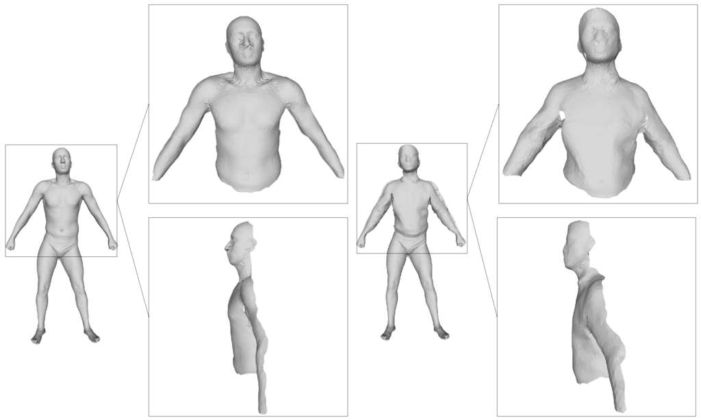 We obtain the dense reconstruction of upper parts of the body. The left figure is our template driven by the current reference frame before deformation. The right figure is an instance obtained through deforming several body parts of our template.