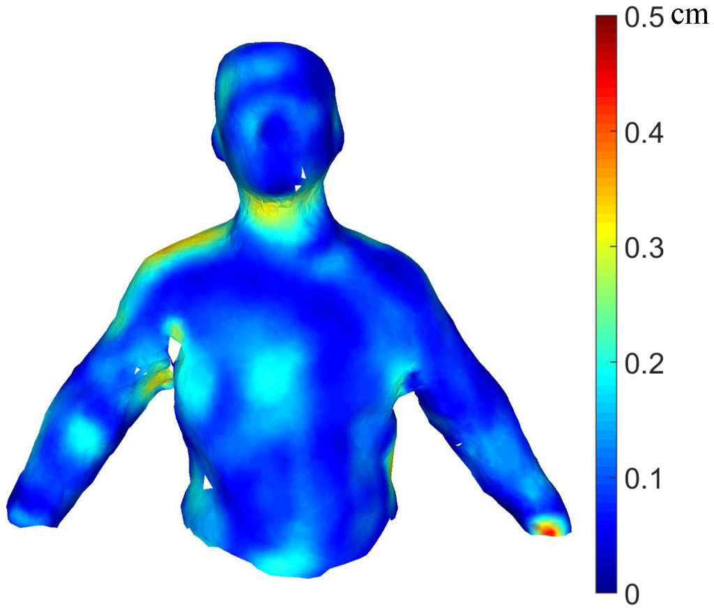 To validate the CPD algorithm in our point registration, we map the Euclidean distances of the correspondent points provided by CPD to the color space. The registration error is shown in Figure 8. As the preceding figure demonstrates, the registration result is acceptable. The maximum error is 0.5 cm, located in a small region of the left arm. The number of points transformed in the template is 2689, and the mean registration error is approximately 0.8 mm. Although the registration result contains some noise points, they have little effect on the following steps.