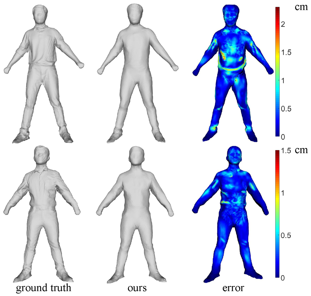 To our knowledge, no other method can automatically recover the shapes of dynamic people from a single RGB camera; we show only the quantitative comparison between our system and KinectFusion. The model is recovered using KinectFusion for people in a static pose. The template we use contains 12,500 points and 25,000 faces. To precisely measure our reconstruction error, we align the front part of our model to the KinectFusion results using the rigid iterative closest point (ICP) algorithm and map the Euclidean distance of the closest points to the color space to show the reconstruction error intuitively. As Figure 12 shows, the average reconstruction errors are 0.3 cm and 0.2 cm for the first sequence (the first row in Figure 12) and the second sequence (second row in Figure 12), respectively. The maximum reconstruction error is 1.5 cm for all sequences in our dataset. In the first sequence results, the error occurs mainly around the waist, where the clothing is very loose. There are some different poses in the second sequence (the first row in Figure 10). Note that the watertight model shown in the second row in Figure 12 has less reconstruction errors than the first one due to the tighter clothing, which shows the robustness of our system.