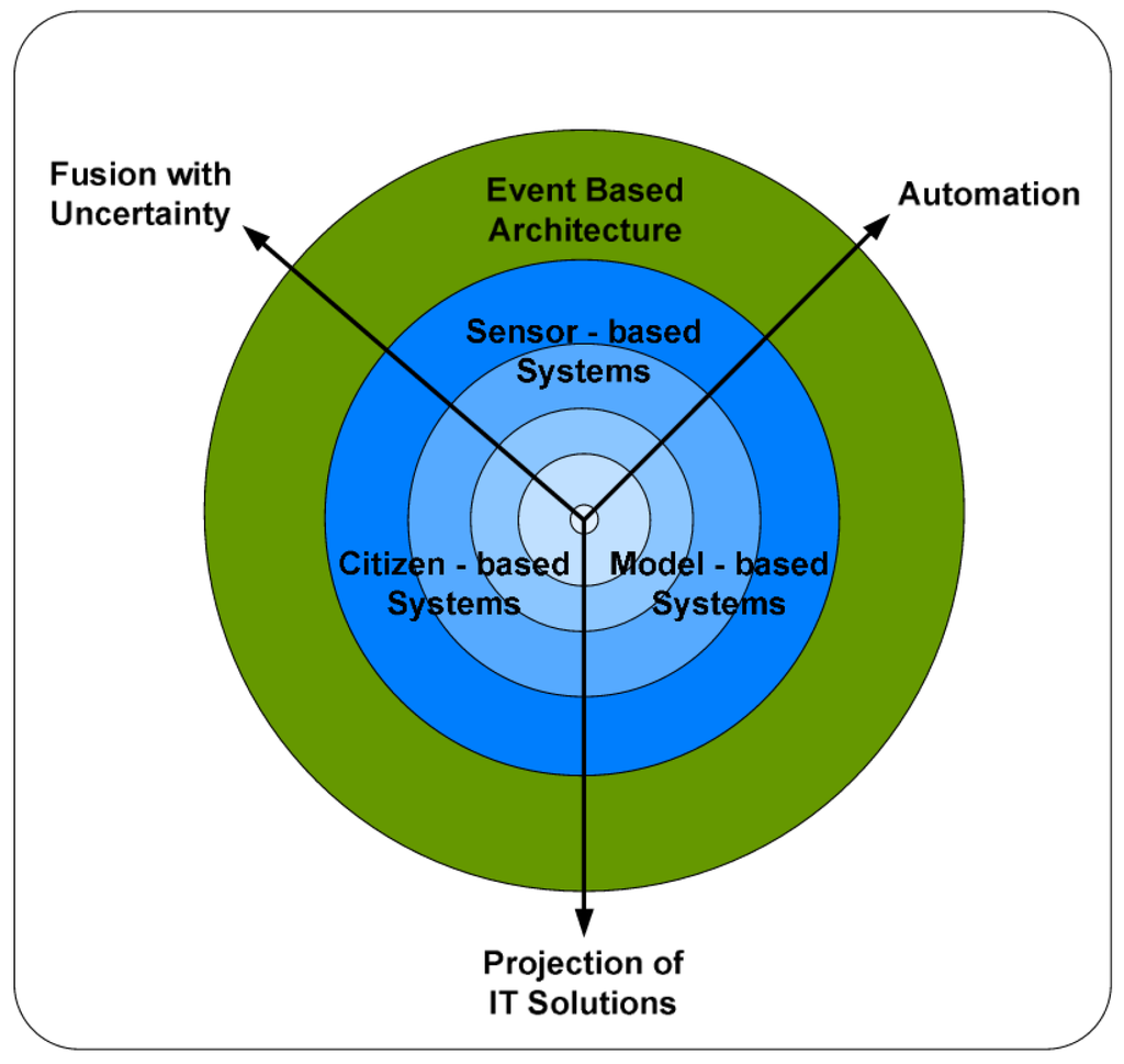 Pervasive computing and citizen science provide completely new channels for environmental sensing. Official data can be complemented and even substituted through citizen-driven initiatives. This process is however not straightforward. The integration and fusion of data from different sources, which were acquired in different contexts with heterogeneous methods and tools, face serious interoperability issues on the technical, semantic, organization and legal levels [10]. Schade and Craglia [11] outline several challenges bounding the future development of the sensor web (Figure 1). Whereas the concentric blue circles in the center of the figure illustrate the need to address different data aggregation levels (beginning with raw data in the very middle), an event-based architecture will be required to unite all datasets and streams, independent of their origin, this being sensor measurements, modeling results or people’s observations. Three transversal challenges are cross-cutting through the figure: (i) the automation (optimized machine support) of underlying processes; (ii) the projection/re-application of general IT solutions (e.g., to address security and privacy issues); and (iii) data fusion/integration, including the propagation of uncertainties throughout the applied algorithms.