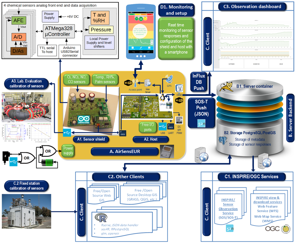 - Technical capability for the implementation of on-the-fly calibration through the possibility to push data directly from each sensor node to the “R” statistical package, where calibration curves and other post-processing can be done.