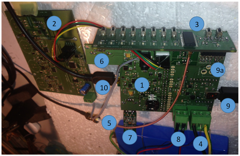 The sensor host (A2 in Figure 2) is based on the Arietta G25 (ACMESystem-IT) and consists of a low cost Linux embedded module CPU Atmel (400 MHz ARM9TM processor) loaded with 256 MB of DDR RAM. It also accommodates other devices: a 32-GB SD card with pre-installed Linux, a GPS, a GPRS and a WiFi access point.