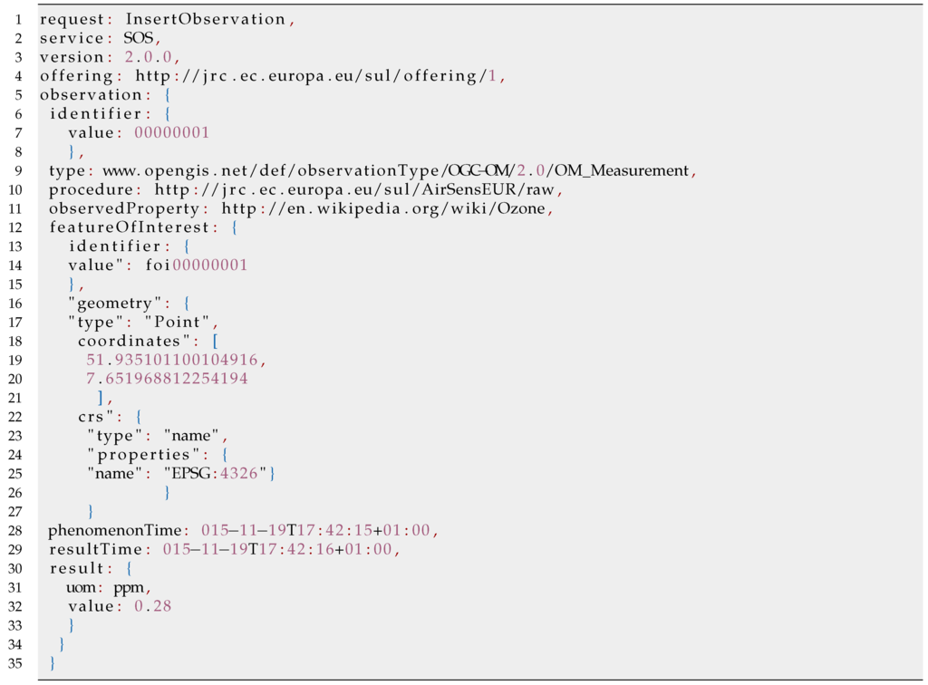 The use of SOS-T as the means for the migration of data from the sensor host to the server provides us with several significant advantages over a direct web access to the AirSensEUR database. Those include (i) high level of security (the sensor host does not provide credentials for access to the database, and InsertObservation requests are limited to a predefined number of IP addresses), as well as (ii) independence from the database schema. Furthermore, the JSON syntax of the request is minimalistic in terms of size and is therefore well suited for the transmission of big volumes of observation data. A sample InsertObservation request is provided in Figure 4.