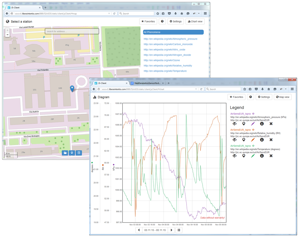 User interface of the SensorWeb client, loaded with AirSensEUR data.