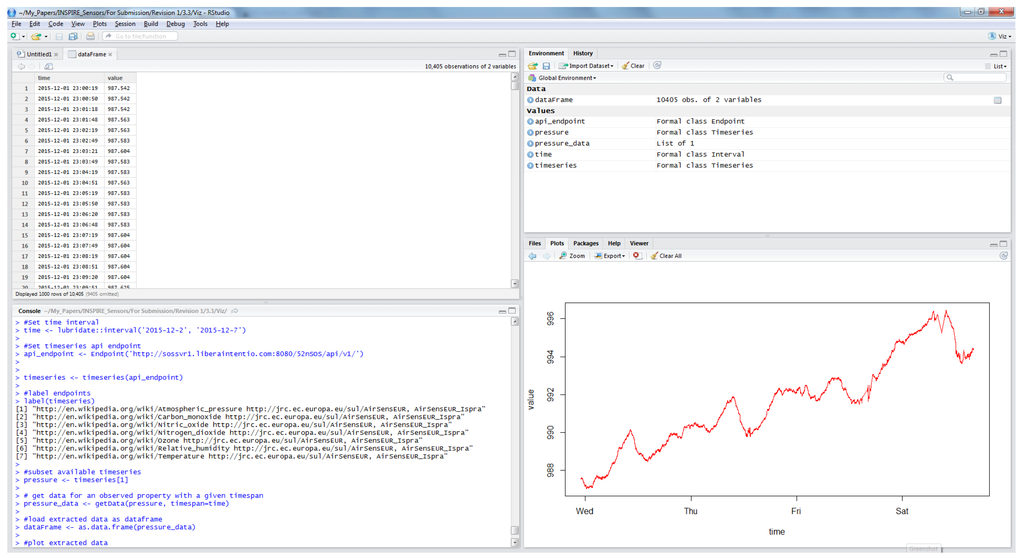 Furthermore, data from AirSensEUR can be pulled directly from the console environment of the “R” statistical package (Figure 6) through the sensorweb4R library [31]. This provides numerous opportunities for additional processing (e.g., calibration) and visualization.