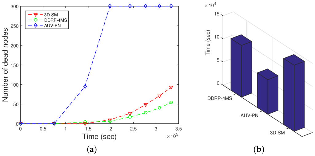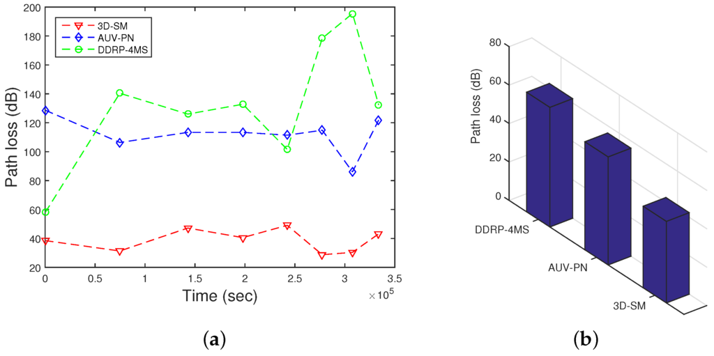 In Figure 11, path losses are shown. In 3D-SM, path loss is less in comparison. The whole plot of 3D-SM does not change as drastically as AUV-PN and DDRP. AUV-PN is a cluster based with MS routing protocol; path loss linearly increases at a higher rate in comparison, up till the NLT. After that, around 70,000 s, its behavior slightly varies; however, when the number of dead nodes is increased, the path loss also increases because the network becomes sparse. In DDRP, during the NLT, there is a slight increase in the path loss; however, after the death of the first node, the path loss decreases, because nodes start dying, which leads to an increasing time and abrupt change in path loss when the network is sparse. In 3D-SM, the NLT is longer compared to the existing schemes due to balanced transmissions between nodes and the MS (or CNs). The network is designed in such a way that nodes transmit the sensed data when the distance from the MS (or CN) is the least and avoid path loss.