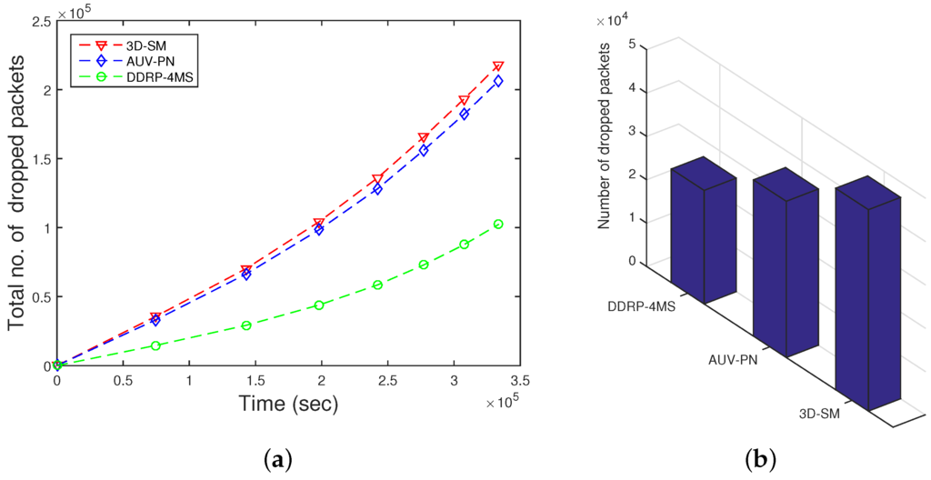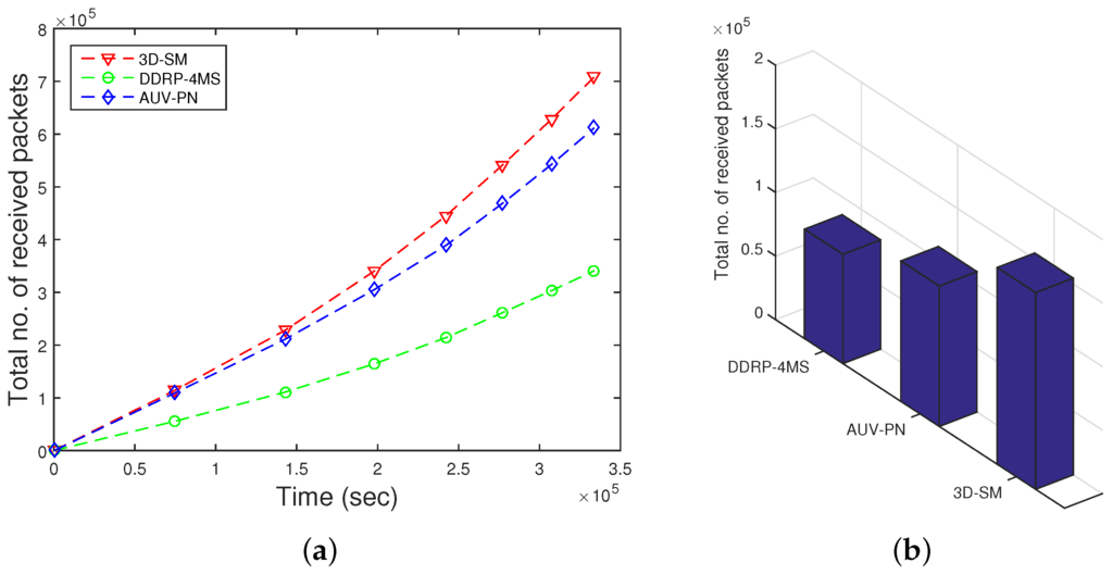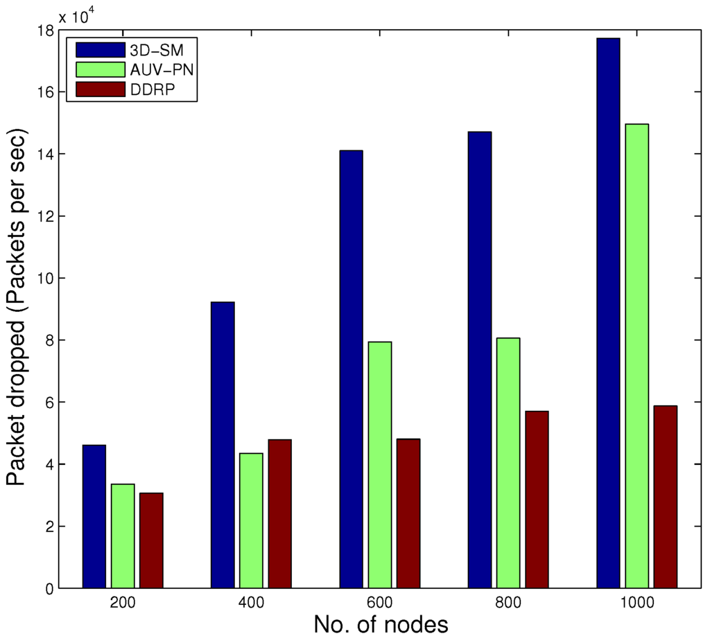 In AUV-PN, there is a greater probability of packet drops, as this protocol engages two-hop transmission of the MN’s data through the CH to the MS. Furthermore, it depends on the number of packets sent to the sink; DDRP’s throughput is less in comparison with 3D-SM.