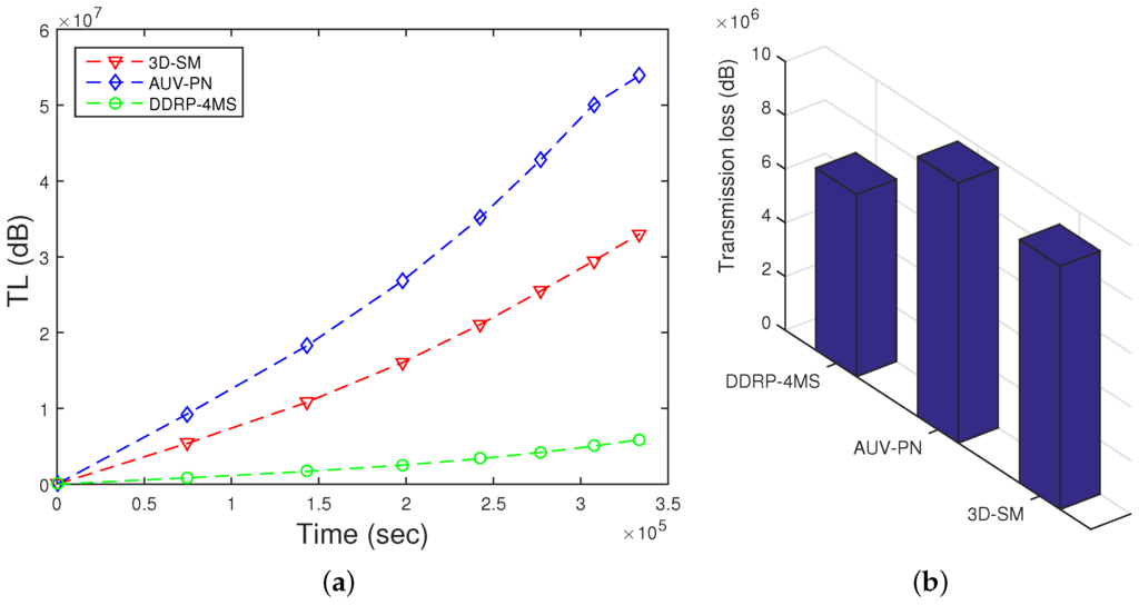 Figure 15 shows the transmission losses, with the change in the number of nodes. In SM-3D, transmission losses linearly increase. In AUV-PN and DDRP, transmission losses exponentially increase with increased node density.