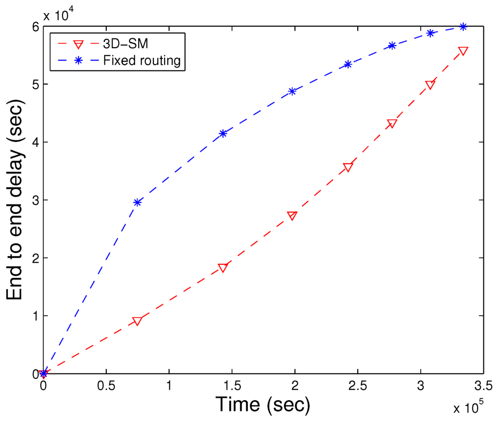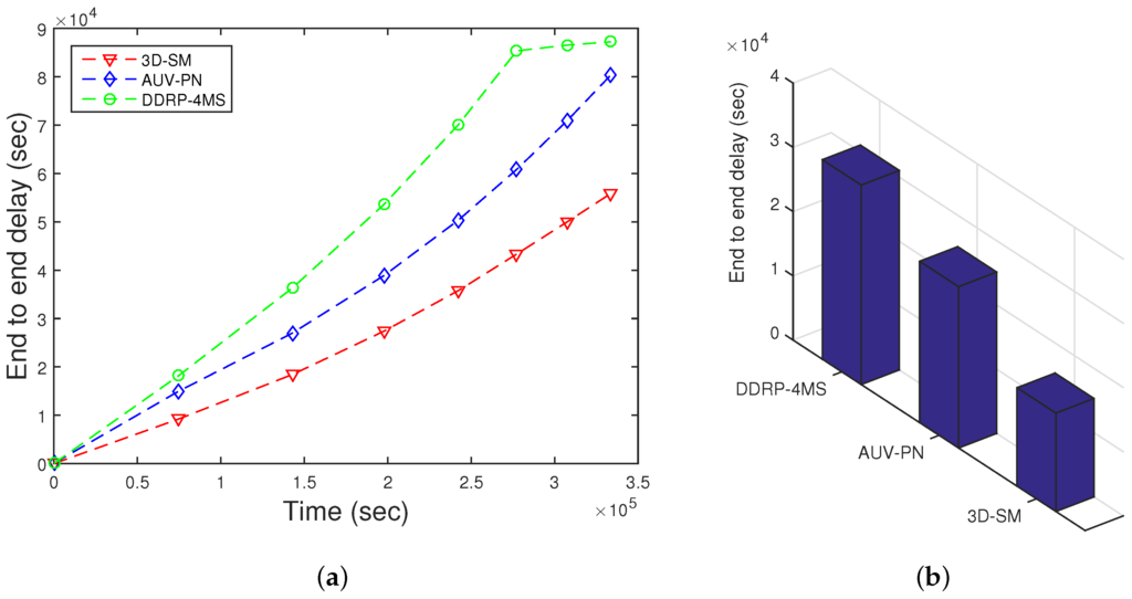 End to end delay depends on the speed of the acoustic signal and the transmission distance. Here, s denotes the distance between the source node to the MS/CN; the speed of acoustic signal varies from 1450 m/s to 1500 m/s, depending on the depth of the water. As , end-to-end delay is directly proportional to the communication distance. In Figure 13, end-to-end delay of three schemes is presented. On the x-axis, the lifetime of the network is shown. On the y-axis, cumulative values are plotted. DDRP has greater end-to-end delay because nodes wait until the MS arrives at a nearby stop to receive data; otherwise, data are forwarded via multi-hopping. In AUV-PN, nodes transmit the sensed data to their respective PN’s. When the AUV starts the data gathering tour, first, it obtains the list of PNs from CHs, and afterwards, it visits each PN for data gathering according to the list. This procedure increases the delay. In our proposed scheme, 3D-SM, the MS gathers data form the nodes after a regular interval. In the rest of the regions, CNs transmit the collected data to the MS, which leads to relatively lower end-to-end delay. After the stability period ends, nodes start to drain their energy. Once a node drains its energy, it is no longer able to participate in sensing and transmission; we call it a dead node. As the number of dead nodes increases in the network, the sparsity also increases, which leads to end-to-end delay. Interestingly, the end-to-end delay seems inappropriate for delay-tolerant applications. However, our solution is appropriate, as the calculated value (140,000) of end-to-end delay is cumulative; its average value is 190 s.