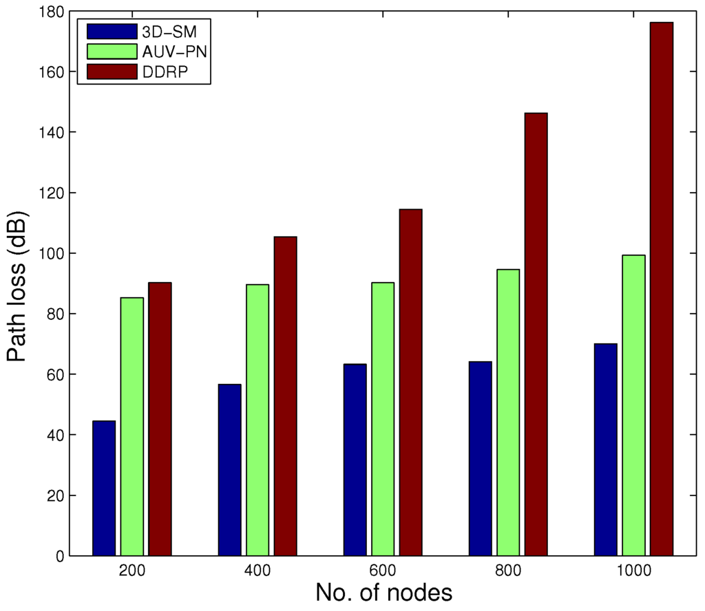 Path loss with increased node number is shown in Figure 16. There is a slight variation in the path loss value in 3D-SM and AUV-PN, while in DDRP, by increasing the number of nodes in the network, the path loss also increases exponentially.