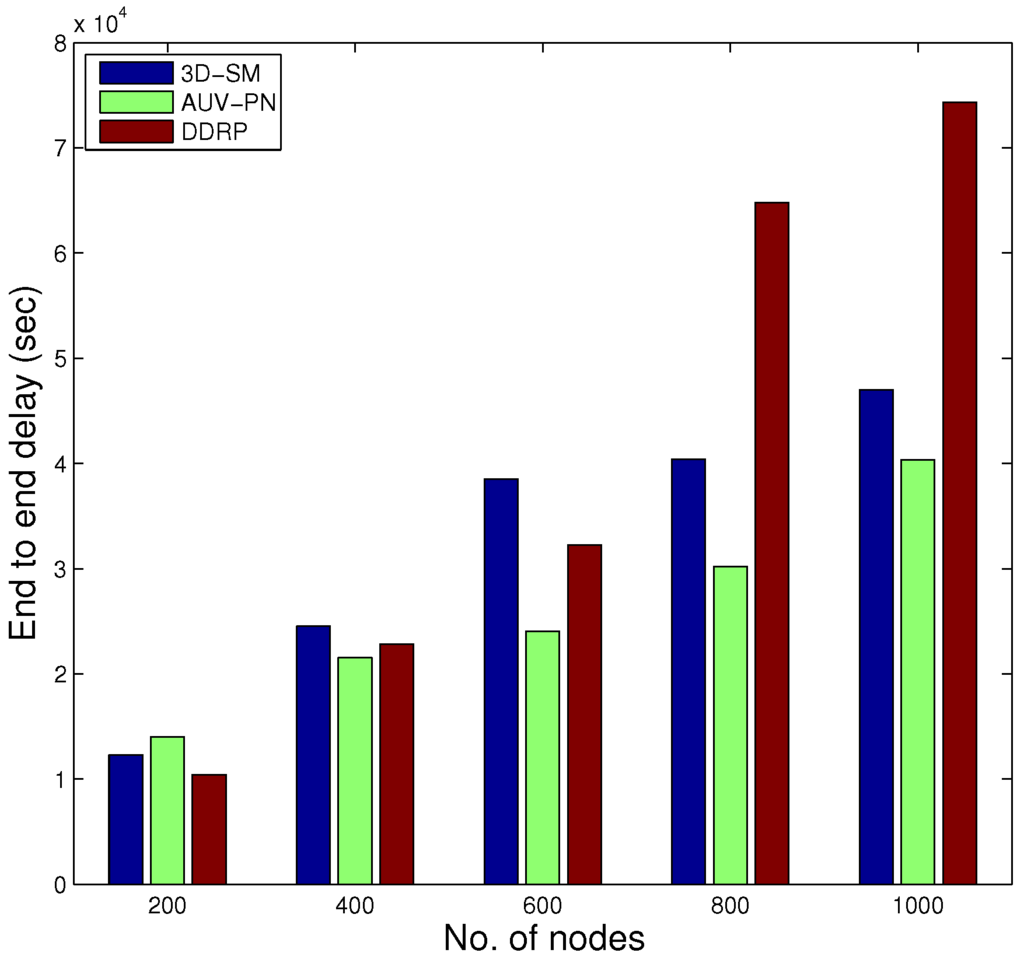 Our proposed 3D-SM and the existing AUV-PN and DDRP are simulated by varying the number of nodes in the network ranging from 200 to 1000.