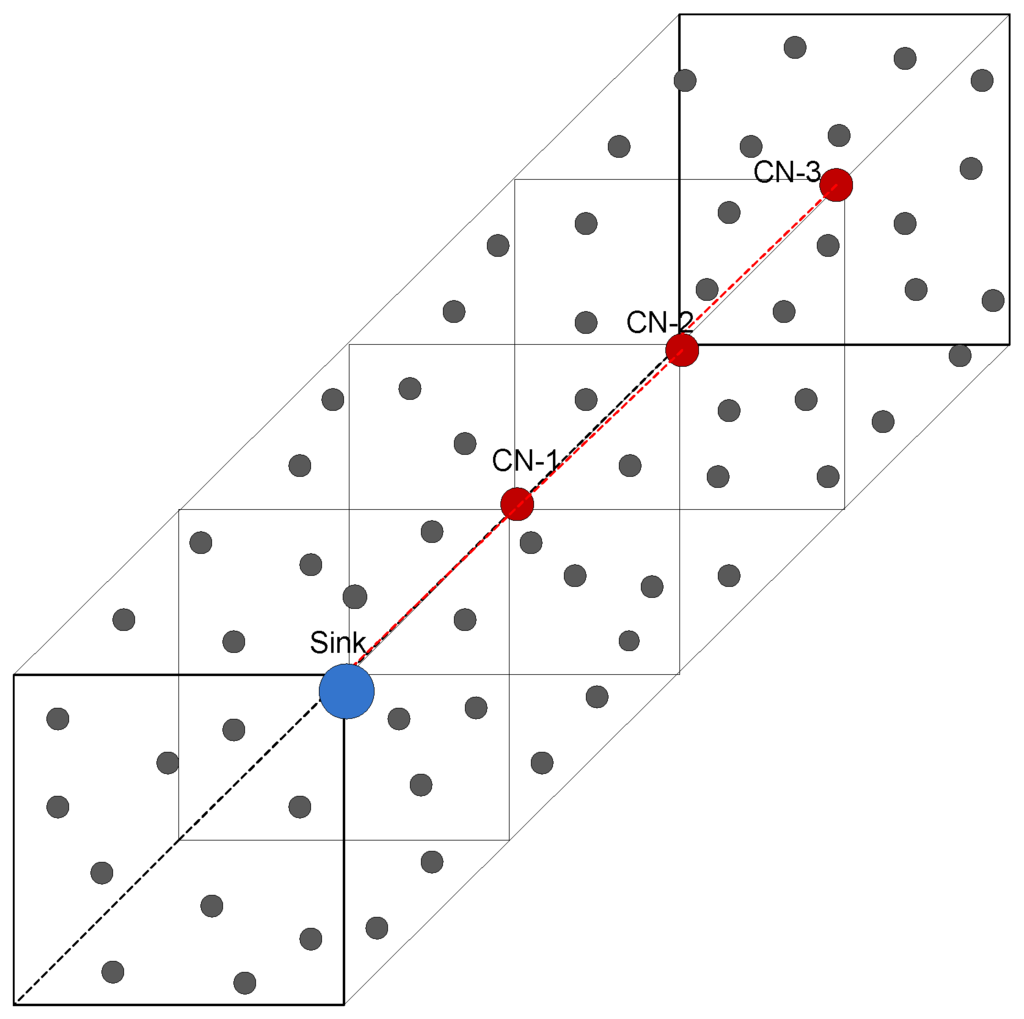 In our proposed scheme 3D-SM, we consider sink mobility to enhance the performance of the network. We consider a network field with dimensions 500 m × 500 m × 1000 m. The network is logically divided into four RCs. In each RC, either the MS or CN is deployed for data gathering from nodes at the least distance. The CN gathers data from its RC and further sends it to the MS. In order to find the difference between fixed routing and sink mobility, we perform simulations, where the network dimensions and number of CNs and MS are kept the same for both fixed routing in 3D-SM. In Figure 19, the architecture of fixed routing is shown. The sink and CN are static, and they are receiving data through direct communication (in order to keep the comparison fair). Far away CNs send their data through multi-hop communication, shown in Figure 19.