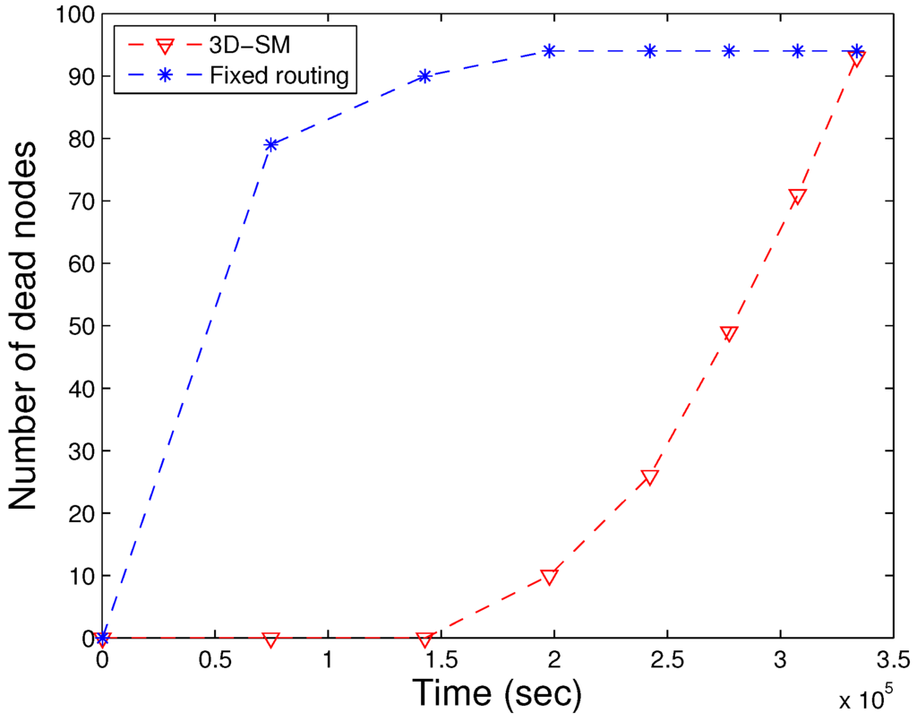 We compare the results of both schemes in the same environment; one is fixed routing, and the other is the proposed scheme, 3D-SM. As we defined NLT as the time duration from the start of the network till the death of the first node, in Figure 20, the NLT of 3D fixed routing is less compared to 3D-SM, because of the static sink and CNs. The load between the nodes is managed in 3D-SM, which prolongs the network lifetime. In fixed routing, the distance between nodes and the sink (or CNs) is fixed, so the nodes that are far drain their energy quickly.