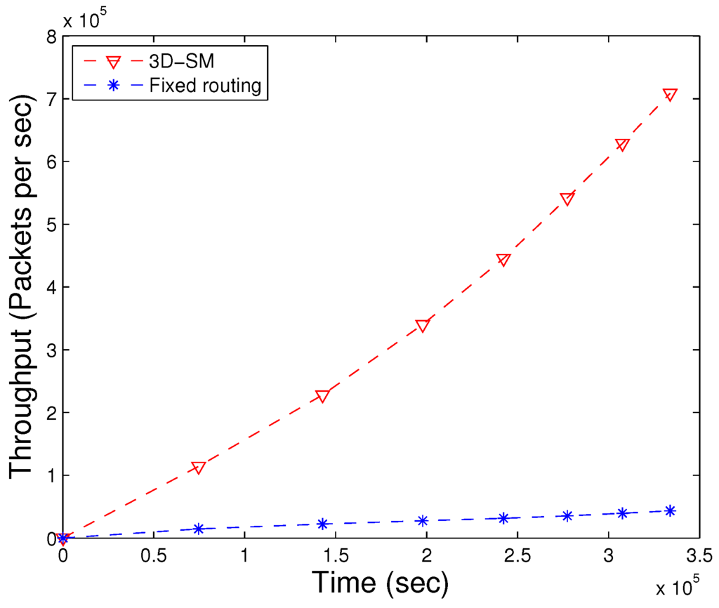 The trade-offs made by the selected routing protocols are given in Table 4 3D-SM has increased throughput, however, at the cost of increased packet drops. The transmission pattern here is direct; after sensing the data, nodes wait for the MS or CN to send them data. In this way, end-to-end delay is minimized by introducing an efficient tour of the MS, as well as CNs. The presence of the CN is contributing to the NLT maximization; however, at the same time, this is the reason for the TL in 3D-SM. We applied a random uniform model for calculating the packet drops, where the packet drops are directly proportional to the throughput; the higher the throughput, the higher the packet drop ratio.