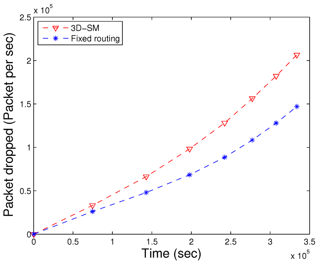 The MS and CNs, when moving in the network, actively gather data from the nodes in 3D-SM. However, nodes are sending the data through fixed routes to CNs (or the sink), and the throughput of fixed routing is less compared to 3D-SM, as shown in Figure 21. In Figure 22, the packet drop of both schemes are shown. In fixed routing, the ratio of the packet drops is high compared to the throughput (the number of packets successfully delivered). Because of the distance and underwater harsh environment, nodes that are far from the sink (or CNs) lose the transmitted packet. The packet dropped ratio also increases when CNs forward the received data through multi-hop communication.