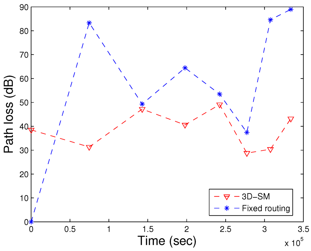 In Figure 23, 3D-SM has higher transmission losses compared to fixed routing, because when the network operation starts, nodes quickly die in fixed routing. With the decrease in the number of alive nodes, the transmission loss also decreases. In Figure 24, the path loss of both schemes is represented. Due to the far distance transmission, path losses increase in fixed routing. Nodes send their data directly to the MS (or sink) in both schemes, 3D-SM and fixed routing. In fixed routing, nodes and CNs (sink) are fixed, and far away nodes consume more energy during data transmission; also, the delay increases, as shown in Figure 25.