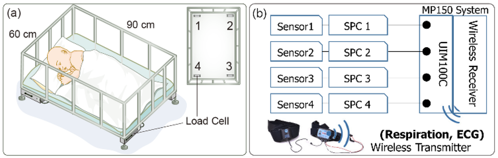 Therefore, this study proposes a non-confining system for monitoring the biological information of infants using BCG technology. In a previous study, we developed a load-cell installed bed to measure the cardiac activity, respiration, and movement of adults [14,15]. The basic concepts of the present system, including the load-cell’s arrangement and the circuit design, are based on the former system. However, the detailed hardware specifications differ to account for relatively lightweight infant subjects. Because it is more difficult to obtain complete BCG signals from their immature hearts, which have smaller cardiac output than adults [16]. In addition, an algorithm that includes an automatic sensor selection with a signal quality check function has been developed to analyze the heart rate (HR) and breathing rate (BR) sagaciously from the four measured load-cell signals. The final objective is to validate and evaluate the feasibility of the infant biological information monitoring system. In experiments on infant subjects, the designed bed was used to acquire biological data, and the biological information from the proposed algorithm was compared with the reference information obtained simultaneously.