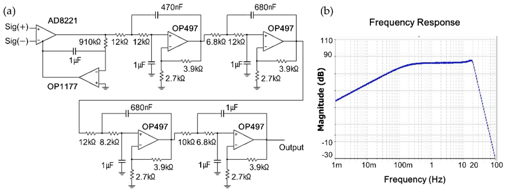 (a) Schematic diagram of signal processing circuit for the load-cell sensor; (b) Simulation results of frequency response of signal processing circuit.