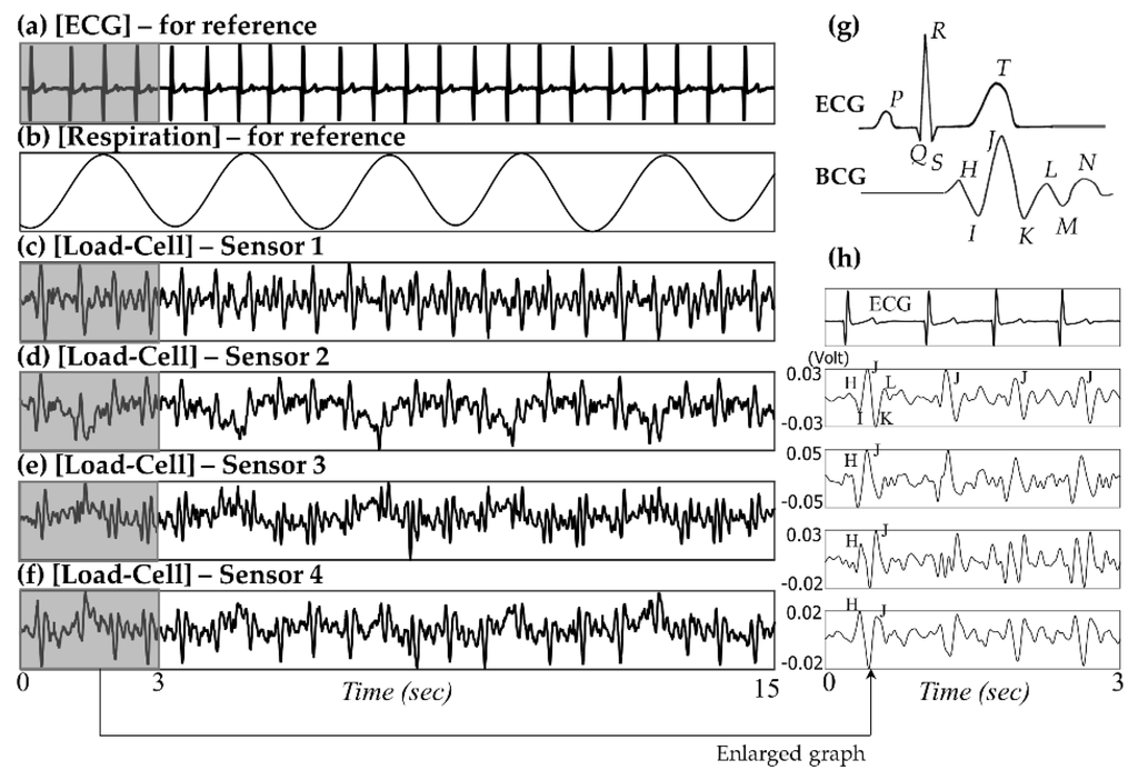 Simultaneous recordings of (a) ECG, (b) respiration signal, and (d)–(f) raw signals from four load-cell sensors, (g) typical BCG waveform (redrawn from literature [19]), and (h) waveform features of the BCG signal in our study.