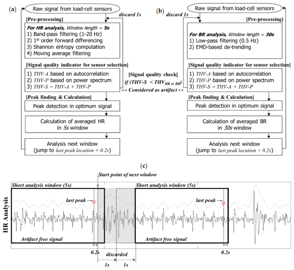 We designed an algorithm that performs automatic sensor selection with a signal quality check function to automatically analyze HR and BR. This algorithm consists of three stages: pre-processing, signal quality check and sensor selection, and peak finding and calculation. The basic concept of the proposed method is to iteratively shift a short analysis window across the signal. Although the overall flow applies equally to both heartbeat and respiration signal analysis, some details concerning the window length, pre-processing method, and criterion for artifact determination differ depending on the analysis objective. Figure 4 shows a flowchart outlining the algorithm used to estimate the HR and BR and its partial example captured when the HR analysis is being processed. The algorithm was independently operated for heartbeat and respiration signals (i.e., there are two separate algorithms).